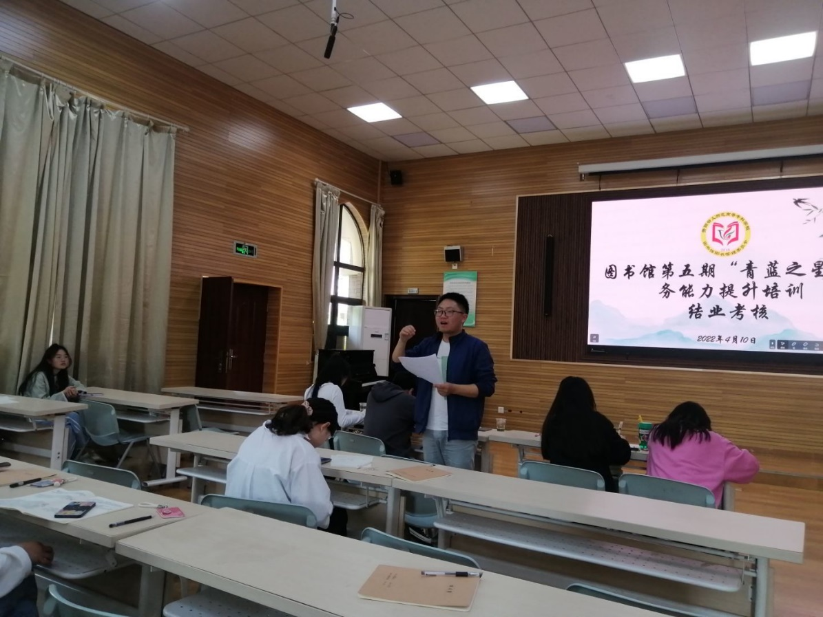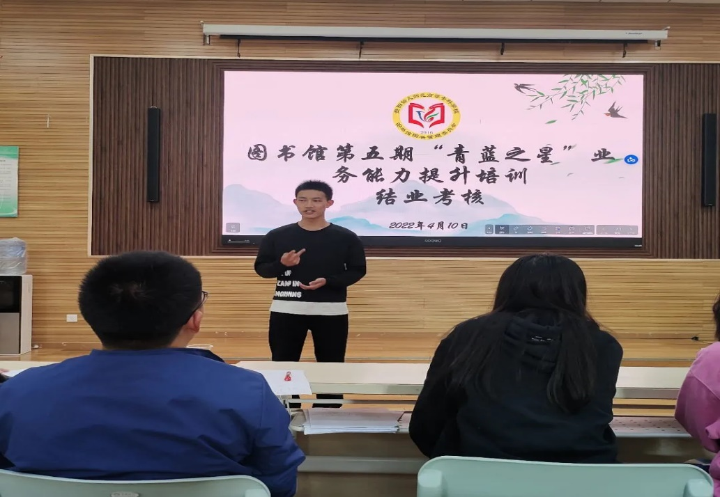 为提升图书管理委员会成员业务能力和水平,全面提高全体成员的综合素质,提升全体成员的实践能力,3月24日至4月9日,图书管理委员会举办了为期半个月的“青蓝之星”业务能力提升培训。经过11门课程的学习和交流讨论,培训课程学习最终取得圆满结束。2022年4月10日下午14:00,图书馆第五期“青蓝之星”业务能力提升培训结业考核在学前合班教室2举行。