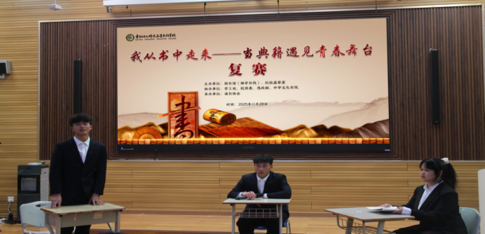 2025年11月28日,由我校图书馆(励学书院)、纪检监察室主办,思政部、中华文化书院协办的“我从书中走来”情景剧创作大赛复赛,在艺术系合班教室二成功举办。作为深入推进廉洁文化、中华优秀传统文化及革命传统教育的重要载体,本次大赛以“沉浸式演绎”为核心,搭建“书籍+舞台”的育人新平台,创新育人形式、丰富教育内涵,引导青年学子在演绎中感悟文化力量、筑牢思想根基、传承红色血脉。赛事自启动以来,得到全校学生积极响应,73支队伍报名参赛,41支队伍提交作品,经线上层层选拔,15支优秀团队晋级复赛同台竞技,最终9支兼具思想性与艺术性的作品脱颖而出,成功晋级决赛。